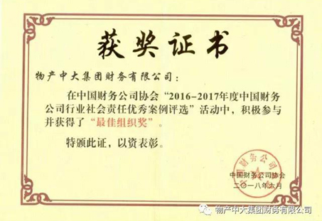 近期,中國財務公司協(xié)會授予物產(chǎn)中大集團財務有限公司“2016-2017年度中國財務公司行業(yè)社會責任優(yōu)秀案例評選...