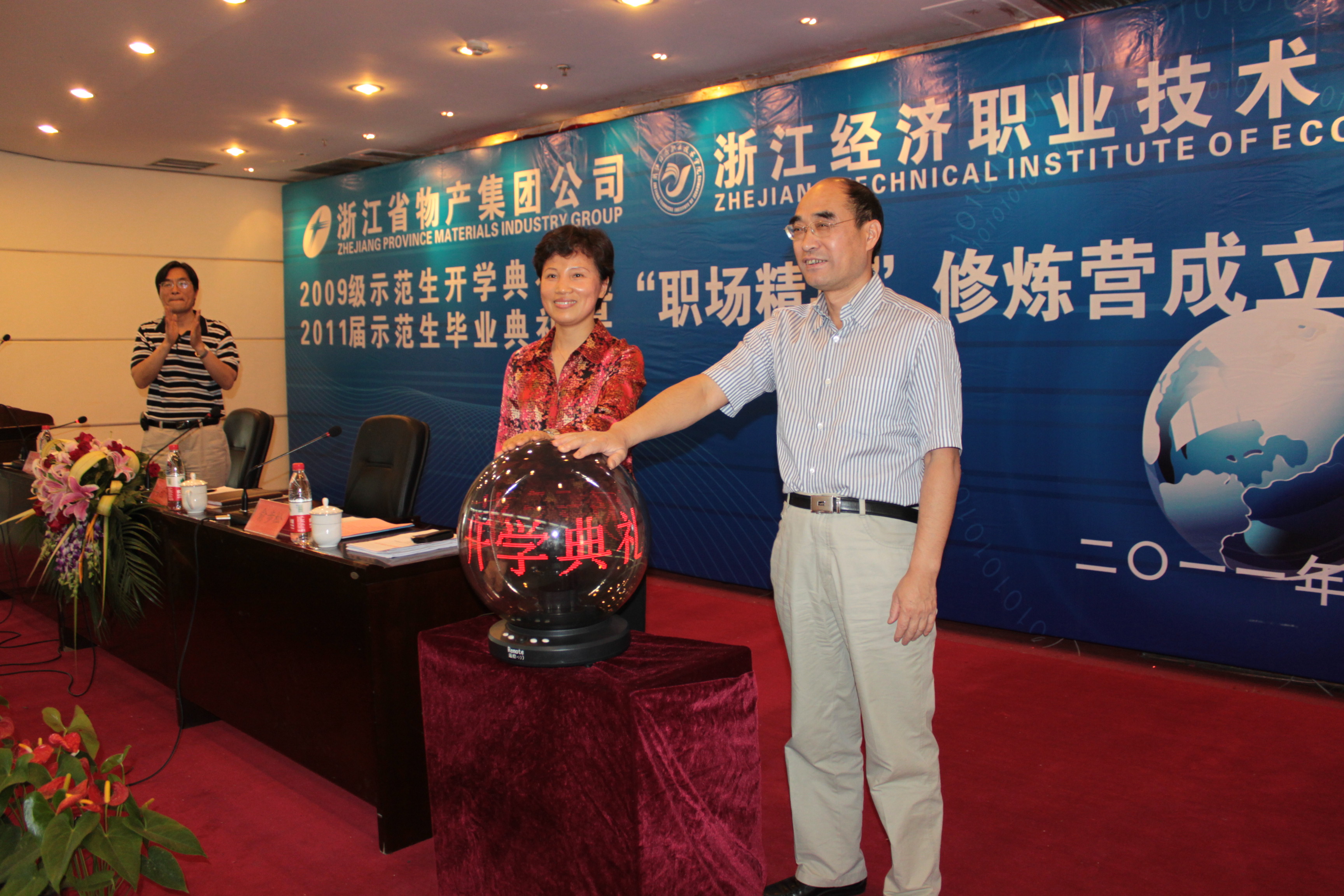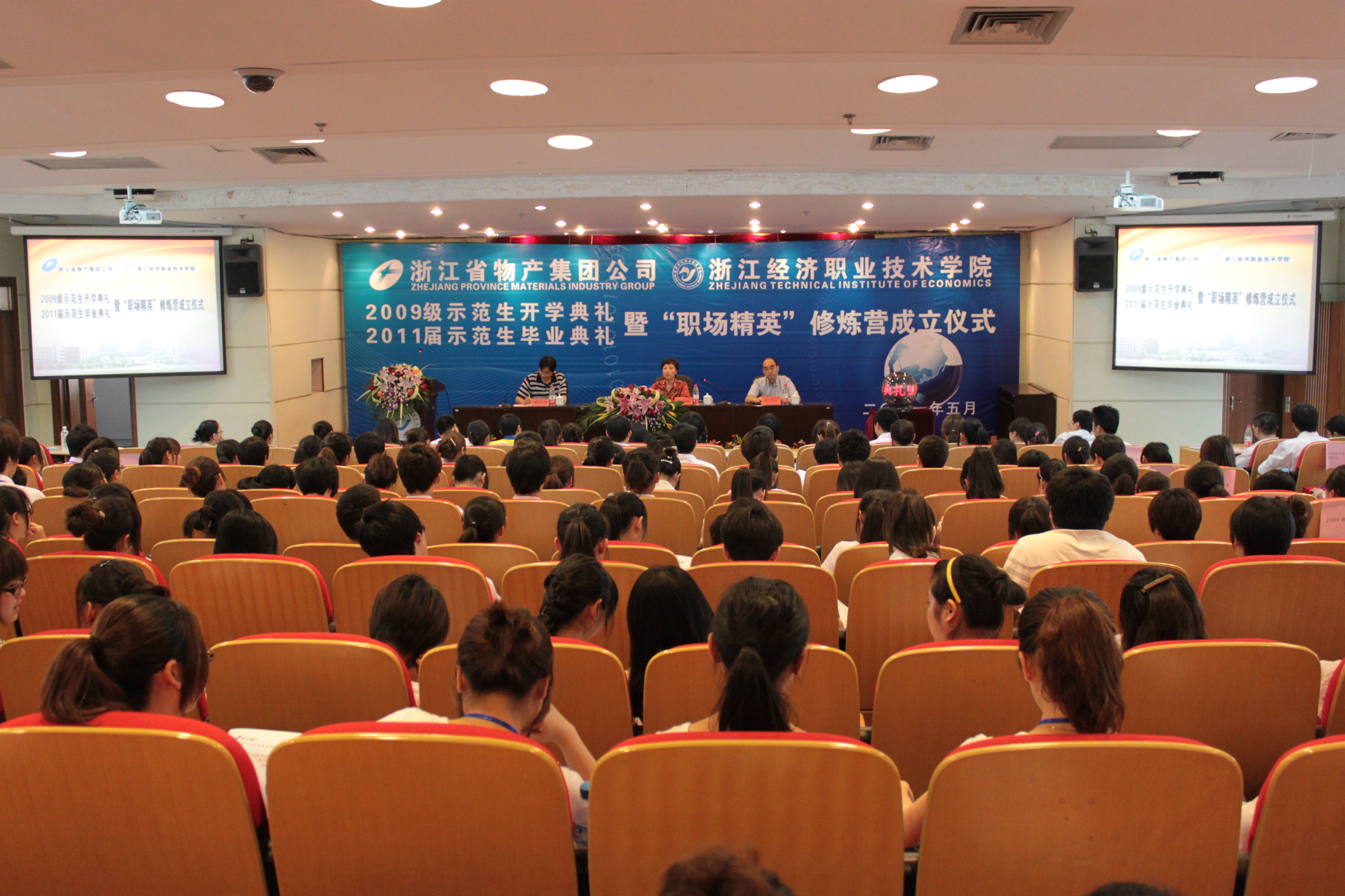 5月19日下午,浙江經(jīng)濟職業(yè)技術(shù)學(xué)院2009級“物產(chǎn)示范生”開學(xué)典禮、2011屆畢業(yè)典禮暨“職場精英”修煉營成立儀式在浙經(jīng)院行政樓3樓報告廳舉行。集團公司黨委副書記周冠女出席了“物產(chǎn)示范生”開學(xué)、畢業(yè)典禮暨修煉營成立儀式,并向2011屆畢業(yè)生獲獎代表頒發(fā)了獎學(xué)金。學(xué)校領(lǐng)導(dǎo)及110余名“物產(chǎn)示范生”、200名“職場精英”修煉營第1期學(xué)員參加了活動。