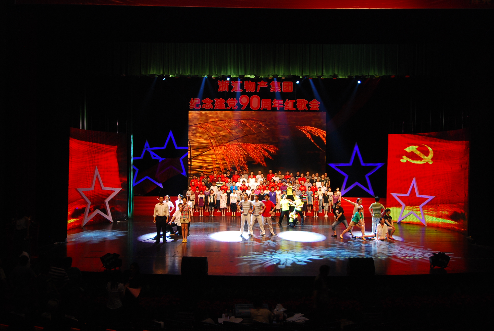 隨后,在一段舒展、優(yōu)美的《紅旗頌》舞蹈中,拉開了集團慶祝建黨90周年“紅歌會”的序幕。高高飄揚的紅旗,閃光耀眼的黨徽,90年光輝的歲月,喚起了大家難忘的紅色回憶。整臺晚會分“閃閃的紅星”、“我愛你中國”、“春天的故事”3個篇章。《聽媽媽講那過去的事情》將觀眾帶回了那激情燃燒的歲月;《十送紅軍》表現(xiàn)了長征路上軍民之間的魚水情深;《紅軍不怕遠征難》讓人重溫了長征的艱難險阻,彰顯了革命先輩們艱苦奮斗的精神;《紅色娘子軍》、《戰(zhàn)地之歌》分別唱出了娘子軍和游擊隊員們在不同戰(zhàn)場上的英姿。隨后,《贊歌獻給黨》、《生日的禮贊》、《我們走在大陸上》、《咱們工人有力量》、《紅色記憶》、《祖國不會忘記》等用不同的方式,歌頌了在共和國不同時期涌現(xiàn)的英雄和他們的感人事跡,反映了新中國各族人民熱愛黨、熱愛社會主義偉大祖國的心聲。第三篇章的《走向復(fù)興》,唱出了中華民族在中國共產(chǎn)黨領(lǐng)導(dǎo)下,信心滿懷,揚帆高歌邁向新勝利的壯志豪情;大型歌舞《在燦爛陽光下》,用鏗鏘的演唱、動人的伴奏,讓激情澎湃在每個人心中;《祝福祖國》則以深情的歌聲,打動著在場的每一個人。晚會最后,集團領(lǐng)導(dǎo)班子帶領(lǐng)集團全體高管人員,與浙經(jīng)院學(xué)生合唱隊組成了大合唱方陣,以飽滿的熱情、嘹亮的歌聲,放聲高歌《沒有共產(chǎn)黨就沒有新中國》、《團結(jié)就是力量》等經(jīng)典歌曲,把紅歌會的氣氛推向了高潮。