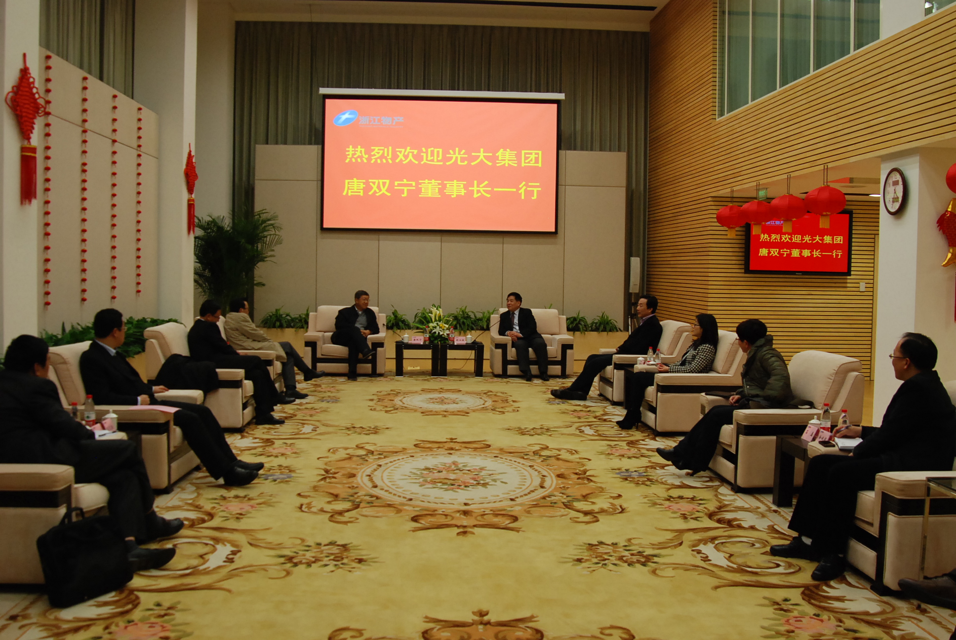 新年伊始,胡江潮董事長在集團(tuán)總部會(huì)見了來訪的光大集團(tuán)董事長唐雙寧、戰(zhàn)略部總經(jīng)理吳富林和光大銀行杭州分行行長鄭學(xué)筠等一行。集團(tuán)公司隋劍光總經(jīng)理、資金運(yùn)營管理中心鄭迎節(jié)總監(jiān)等參加了會(huì)見。