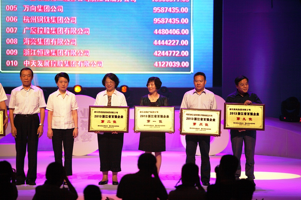 8月28日,浙江省企業(yè)聯(lián)合會、省企業(yè)家協(xié)會及省工業(yè)經(jīng)濟(jì)聯(lián)合會舉辦的第7次會員代表大會暨“2013浙江省企業(yè)領(lǐng)袖峰會”在省人民大會堂隆重舉行。會議揭曉了2013年浙江省百強(qiáng)企業(yè)及制造業(yè)百強(qiáng)、服務(wù)業(yè)百強(qiáng)企業(yè)榜單。我集團(tuán)以上一年度1968.32億元的營業(yè)收入,位居2013浙江省百強(qiáng)企業(yè)首位和服務(wù)業(yè)百強(qiáng)企業(yè)首位。這也是我集團(tuán)連續(xù)第6年蟬聯(lián)榜首。周冠女總經(jīng)理(左4)代表集團(tuán)公司出席會議并領(lǐng)取了獎牌。(阮丹璽/文 魏春/攝)