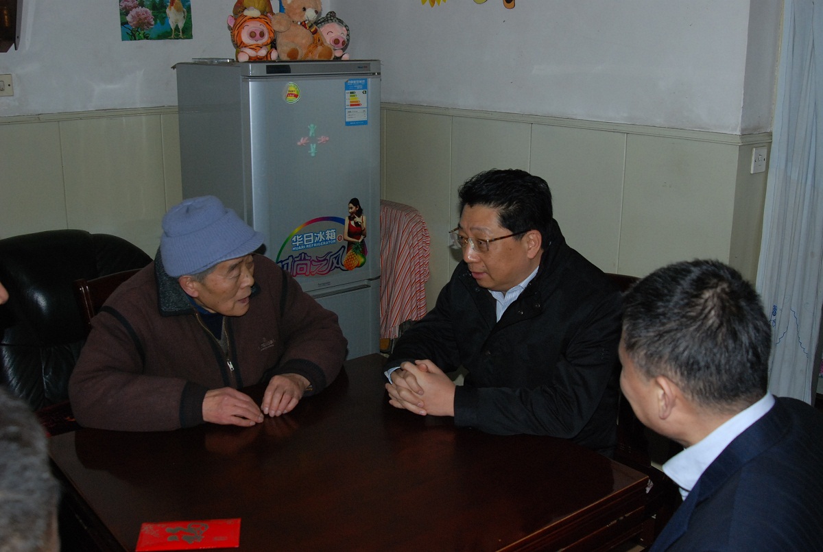圖片說明: 1月8日下午,王挺革董事長在宋宏炯副總經(jīng)理的陪同下看望慰問了物產(chǎn)民爆公司困難職工袁晨初。(辛琪 攝)