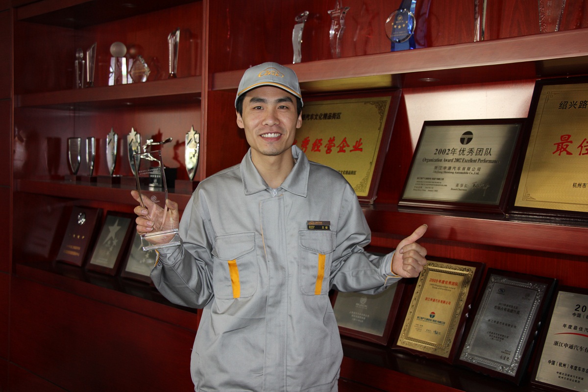 從2014年10月開(kāi)始,上海通用汽車(chē)別克10個(gè)大區(qū)的600多家經(jīng)銷(xiāo)商,通過(guò)線上理論知識(shí)考試與線下鈑噴作品的綜合評(píng)定,以其嚴(yán)苛的評(píng)定方式最終產(chǎn)生20名鈑噴技師晉級(jí)總決賽,爭(zhēng)奪全國(guó)總冠軍的寶座。圖為王熠在公司獎(jiǎng)杯獎(jiǎng)牌墻前留影(張旭峰)