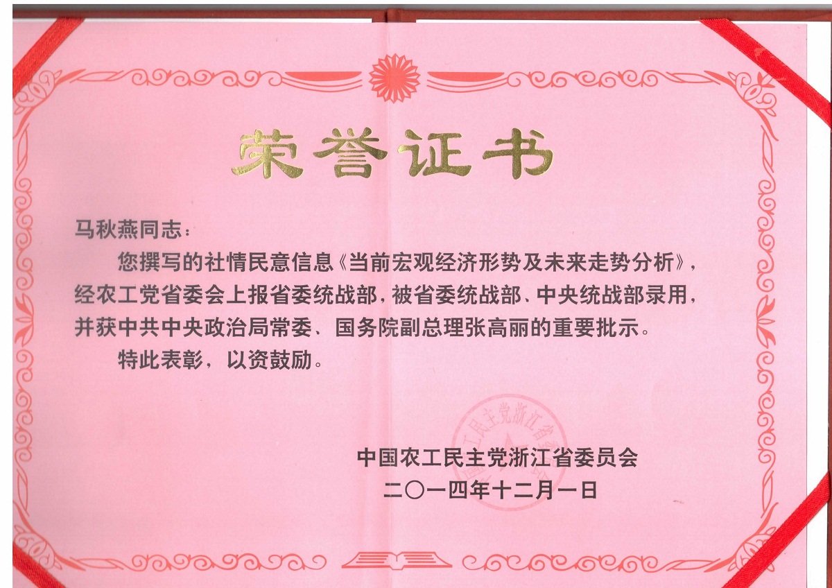 記者從中大期貨公司獲悉,該公司員工馬秋燕今年6月撰寫(xiě)的社情民意信息《當(dāng)前宏觀經(jīng)濟(jì)形勢(shì)與未來(lái)走勢(shì)分析》建議書(shū),經(jīng)農(nóng)工黨浙江省委、浙江省委統(tǒng)戰(zhàn)部上報(bào)中央統(tǒng)計(jì)部,被中央統(tǒng)戰(zhàn)部錄用,并獲得中央政治局常委、國(guó)務(wù)院副總理張高麗的重要批示。近日,中大期貨公司給予物質(zhì)獎(jiǎng)勵(lì),并專(zhuān)門(mén)發(fā)文,通報(bào)表彰馬秋燕鉆研業(yè)務(wù)、執(zhí)著進(jìn)取的精神,號(hào)召公司員工向她學(xué)習(xí)。